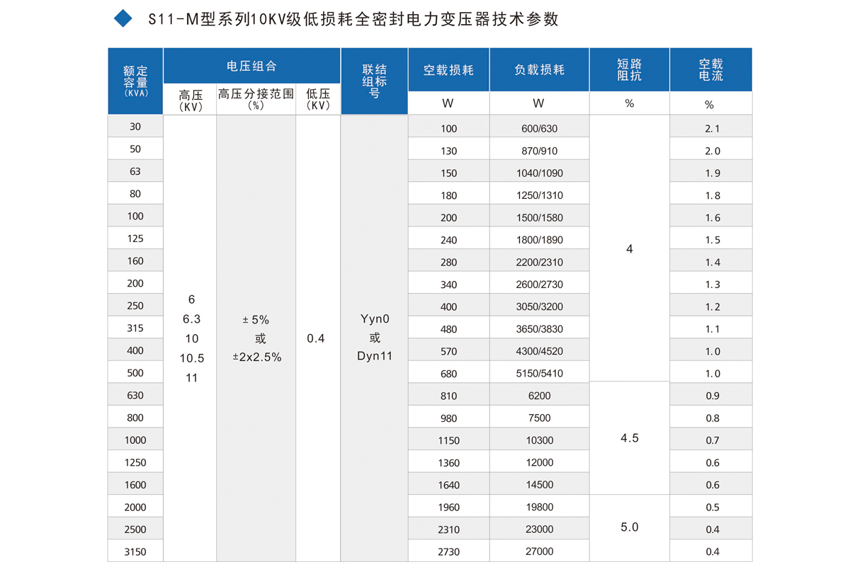 產(chǎn)品介紹 公司生產(chǎn)的S11-10KV級系列三相油浸無勵磁調(diào)壓配電變壓器,具有高效率、低損耗的特點,可節(jié)省大量的電耗和運行費用,社會效益顯著,是國家推廣的高新技術(shù)產(chǎn)品。 該變壓器器身采用了新型絕緣結(jié)構(gòu),提高了抗短路能力; 該變壓器鐵芯由高質(zhì)量冷軋硅鋼鋼片制成; 該變壓器高、低壓繞組均選用優(yōu)質(zhì)無氧銅線,并采用多層圓筒式結(jié)構(gòu); 該變壓器所有緊固件均采用特殊防松處理; 該變壓器油箱為波紋式結(jié)構(gòu),箱蓋和箱沿為完全焊死或以螺栓緊固兩種; 型式,從根本上延長了變壓器油及絕緣材料的使用壽命。 以上標(biāo)準(zhǔn)以最新發(fā)布信息為準(zhǔn);設(shè)備要求應(yīng)以相應(yīng)的最新國家做專業(yè)標(biāo)準(zhǔn)為準(zhǔn)。 運行條件 海拔不超過1000m戶內(nèi)或戶外 最高環(huán)境氣溫+40C 最高日平均氣溫+30℃ 最高年平均氣溫+20C 最高低溫-25C 根據(jù)客戶要求可提供在特殊條件下運行的變壓器。 執(zhí)行標(biāo)準(zhǔn) GB1094.1~2-1996電力變壓器 GB/T6451-2008三相油浸式電力變壓器技術(shù)參數(shù)和要求 GB1094.3-2003電力變壓器