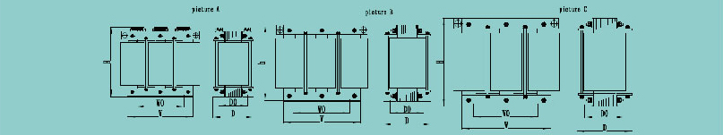 | 三相隔離變壓器型號 | 圖號 | 逆變器功率(KW) | 額定輸出電流(A) | 三相輸入電壓 | 三相輸出電壓 | 變壓器效率 | 重量 (KG) | 尺寸(mm) | | W | D | H | WO | DO | | FSG -10 -EISA -690/400 | A | 10 | 14.4 | AC690V | AC400V | 95% | 110 | 430 | 260 | 450 | 240 | 176 | | FSG -15 -EISA -690/400 | 15 | 21.7 | AC690V | AC400V | 96% | 170 | 430 | 320 | 450 | 240 | 236 | | FSG -20 -EISA -690/400 | 20 | 28.9 | AC690V | AC400V | 96.3% | 175 | 430 | 320 | 450 | 240 | 236 | | FSG -30 -EISA -690/400 | B | 30 | 43.3 | AC690V | AC400V | 96.6% | 260 | 430 | 390 | 520 | 240 | 276 | | FSG -50 -EISA -690/400 | 50 | 72.2 | AC690V | AC400V | 96.8% | 305 | 430 | 390 | 520 | 240 | 276 | | FSG -100 -EISA -690/400 | C | 100 | 144.3 | AC690V | AC400V | 97.6% | 485 | 600 | 470 | 620 | 550 | 288 | | FSG -125 -EISA -690/400 | 125 | 180.4 | AC690V | AC400V | 97.9% | 570 | 600 | 500 | 620 | 550 | 318 |