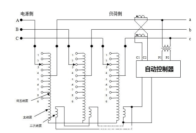 SVR線路調(diào)壓器工作原理及原理圖 線路自動調(diào)壓器是由具有9個(gè)分接頭的自耦變壓器、有載調(diào)壓開關(guān)以及能隨負(fù)荷大小跟蹤線路末端電壓的自動控制器組成。自耦變壓器分為主線圈和調(diào)壓線圈,調(diào)壓線圈每分接頭間電壓差為2.5%總的調(diào)壓范圍為20%,另有三相三角形接線的二次線圈主要用于消除三次諧波以及提供自動控制器及有載調(diào)壓開關(guān)的工作電源。電源側(cè)主接線可以通過有載調(diào)壓開關(guān)從分接頭1到分接頭9切換。負(fù)荷側(cè)主接線根據(jù)用戶需要的調(diào)壓范圍確定固定接線。如用戶需求的調(diào)壓范圍為0~+20%時(shí),負(fù)荷側(cè)主接線固定接在分接頭1上,此時(shí)1檔為調(diào)壓器直通檔;用戶需求的調(diào)壓范圍為-5%~+15%時(shí),負(fù)荷側(cè)主接線固定接在分接頭3上,此時(shí)3檔為調(diào)壓器直通檔;用戶需求的調(diào)壓范圍為-10%~+10%時(shí),負(fù)荷側(cè)主接線固定接在分接頭5上,此時(shí)5檔為調(diào)壓器直通檔。調(diào)壓器負(fù)荷側(cè)A、C相裝設(shè)電流互感器內(nèi)部差接,負(fù)荷側(cè)A、C相裝設(shè)電壓互感器(雙向電源時(shí)電源側(cè)A、C相也裝設(shè)電壓互感器)。線路自動調(diào)壓器(調(diào)壓范圍為-10%~+10%)結(jié)構(gòu)回路原理圖如下: